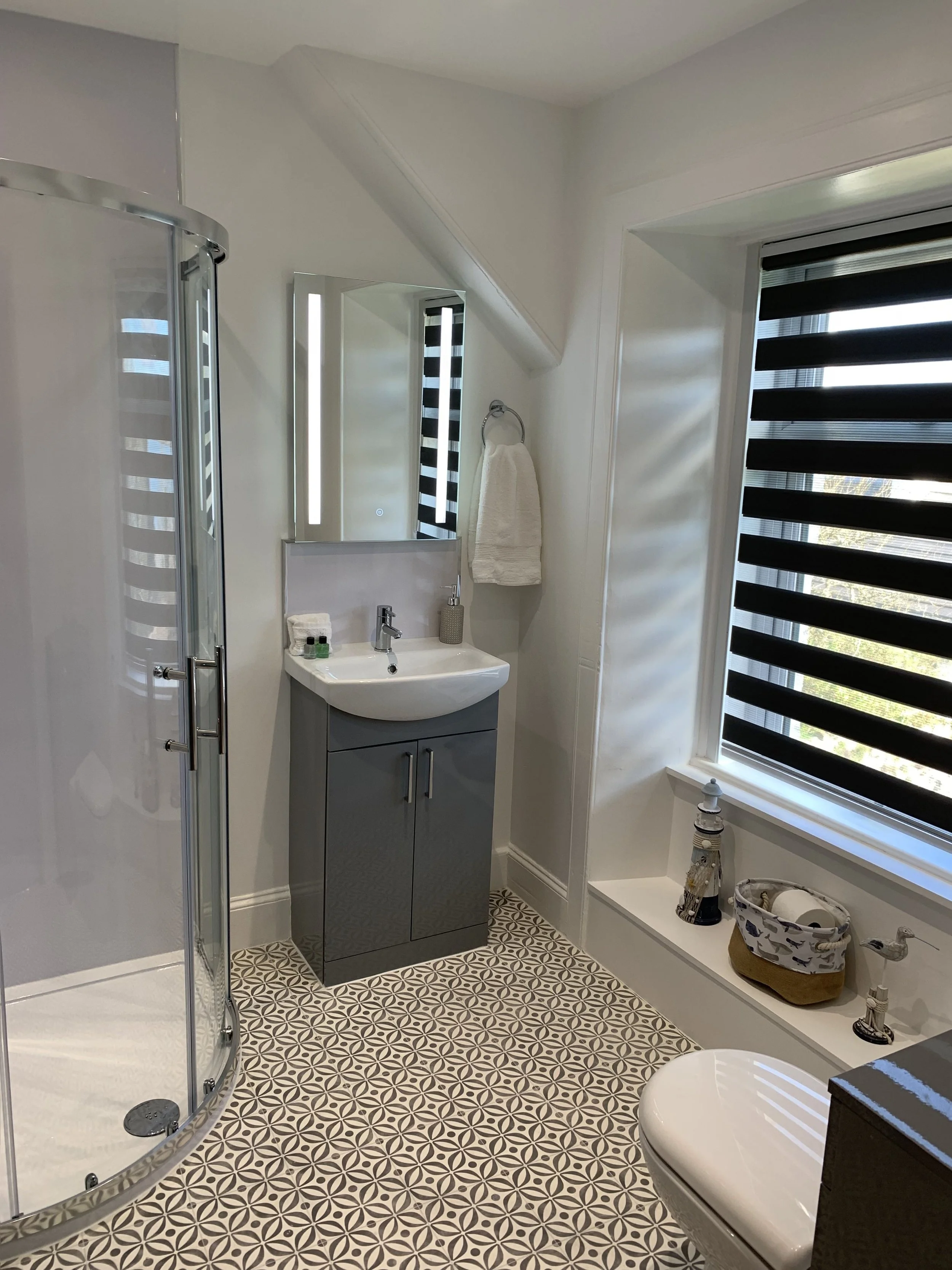 The spacious sea view en-suite, with a sizable walk-in shower. A sink with touch control light-up mirror with shaving socket. We provide two large luxury Egyptian cotton bath sheets, per person, and complimentary Scottish toiletries.