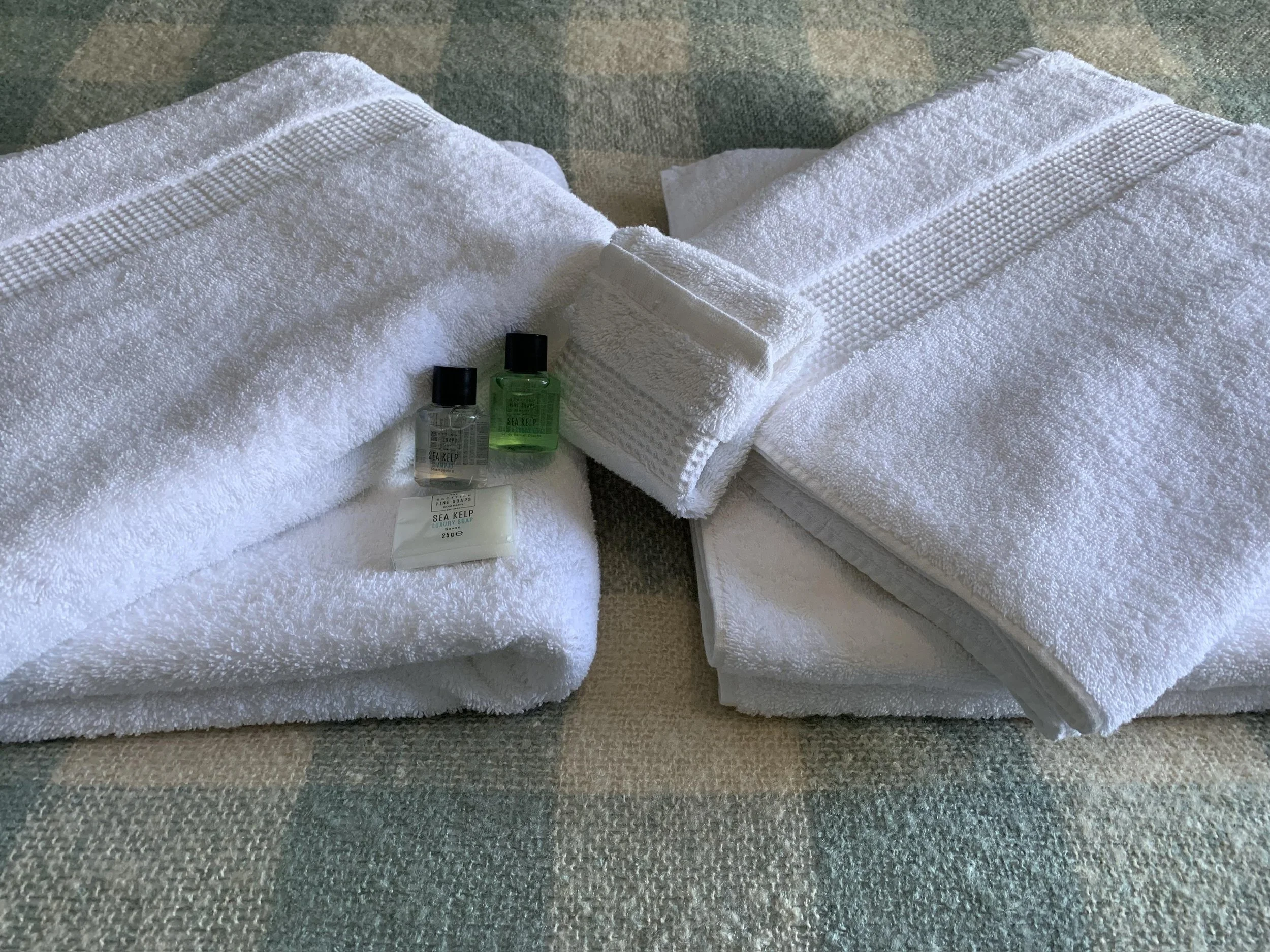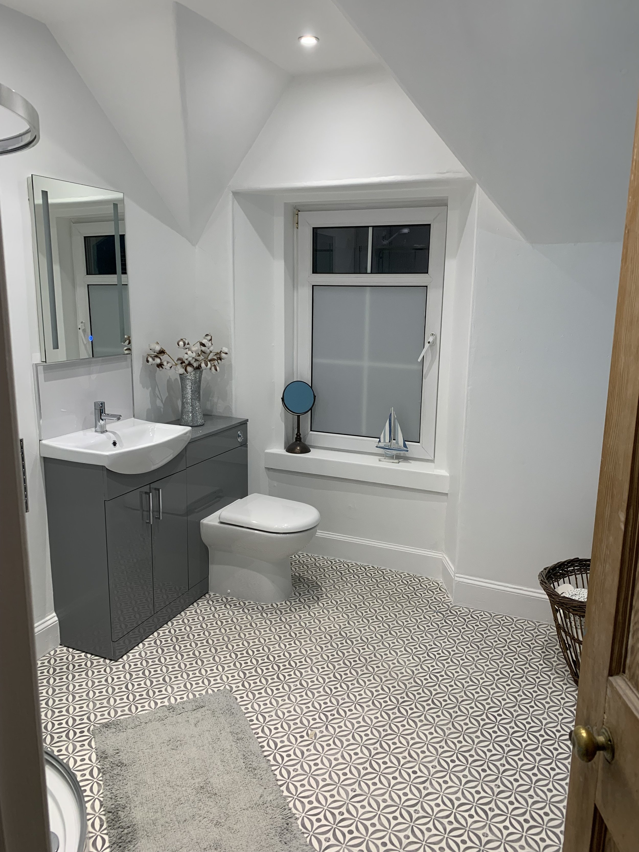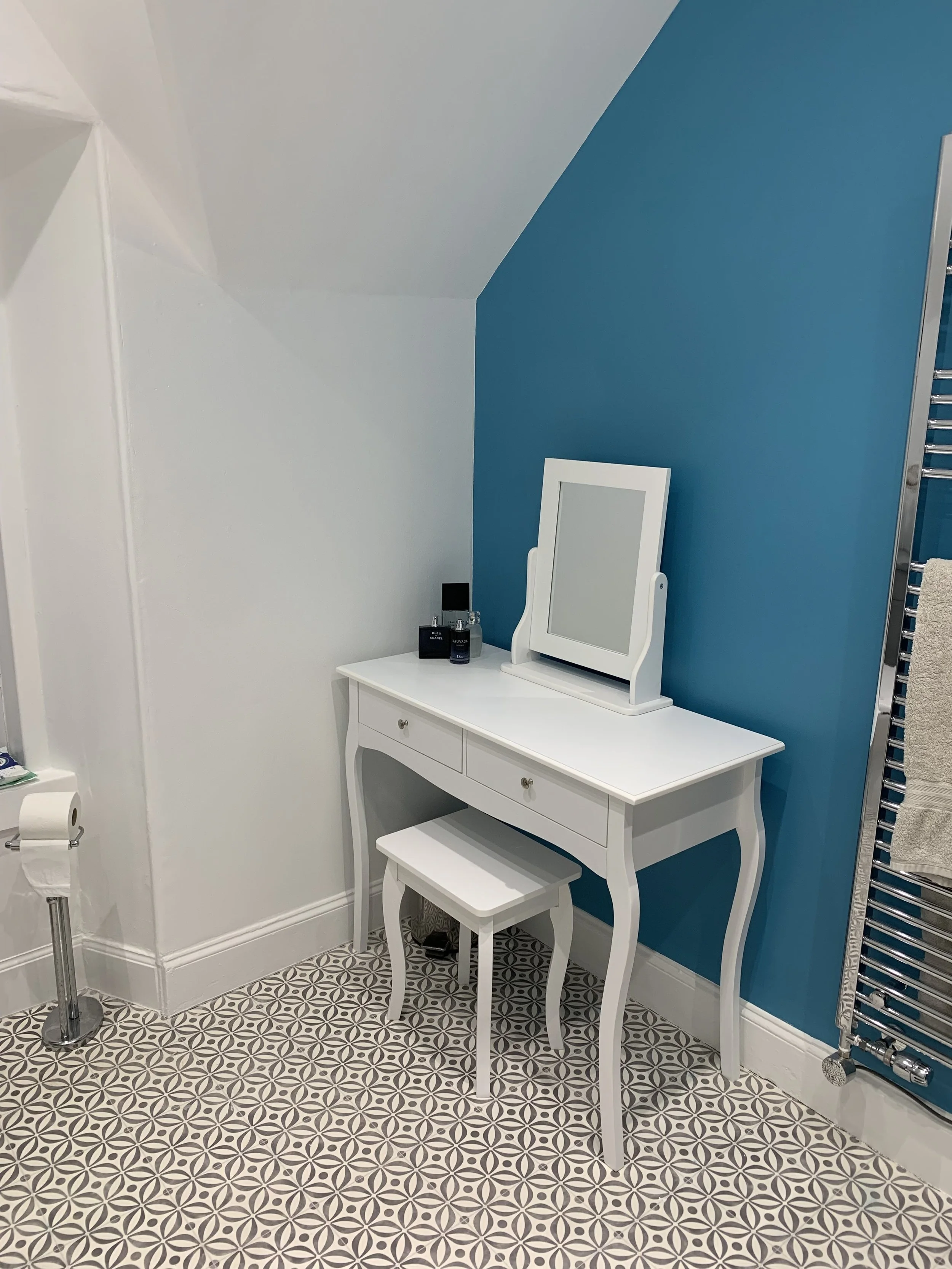 The surprisingly spacious en-suite, with a large walk-in shower. A sink with touch control light up mirror with shaving socket. A dressing table with storage and an additional mirror. We provide two large luxury Egyptian cotton bath sheets, per person, and complimentary Scottish toiletries.